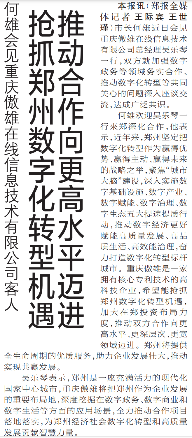 市长何雄近日会见重庆傲雄在线信息技术有限公司总经理吴乐琴一行,双方就加强数字政务等领域务实合作、推动数字化转型等共同关心的问题深入座谈交流,达成广泛共识。(今日《郑州日报》1版)
