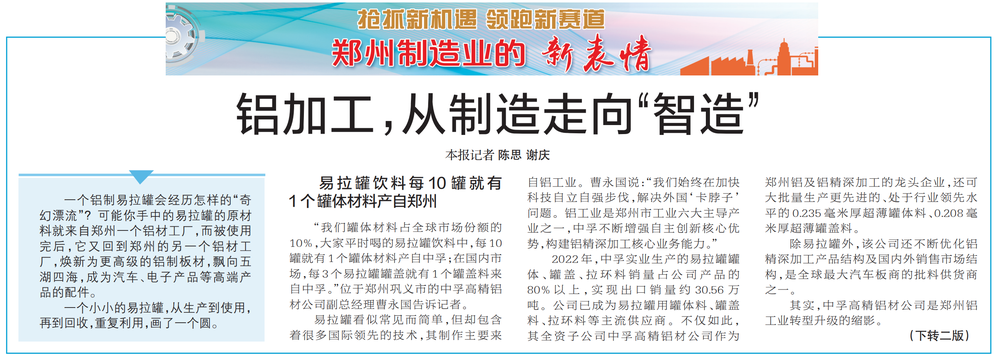 一个铝制易拉罐会经历怎样的“奇幻漂流”?可能你手中的易拉罐的原材料就来自郑州一个铝材工厂,而被使用完后,它又回到郑州的另一个铝材工厂,焕新为更高级的铝制板材,飘向五湖四海,成为汽车、电子产品等高端产品的配件。(今日《郑州日报》1版、2版)