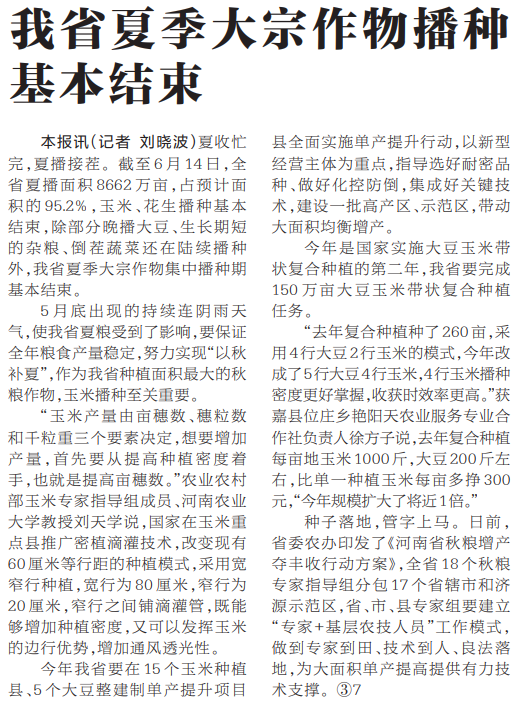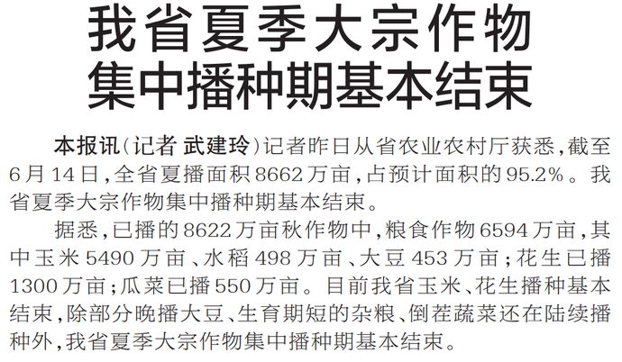 夏收忙完,夏播接茬。截至6月14日,全省夏播面积8662万亩,占预计面积的95.2%,玉米、花生播种基本结束,除部分晚播大豆、生长期短的杂粮、倒茬蔬菜还在陆续播种外,我省夏季大宗作物集中播种期基本结束。(今日《河南日报》1版)