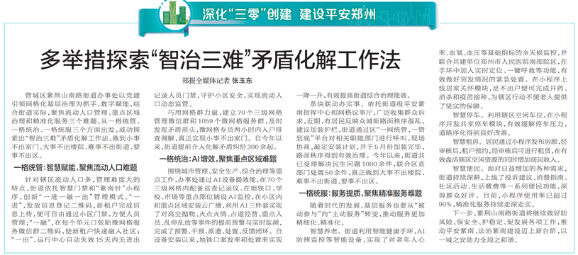 管城区紫荆山南路街道办事处以党建引领网格化基层治理为抓手,数字赋能,结合街道实际,聚焦流动人口管理、重点区域治理和精准化服务三个难题,从一格统管、一格统治、一格统服三个方面出发,成功探索出“智治三难”矛盾化解工作法,做到小事不出家门、大事不出楼院、难事不出街道、要事不出区。(今日《郑州日报》2版)