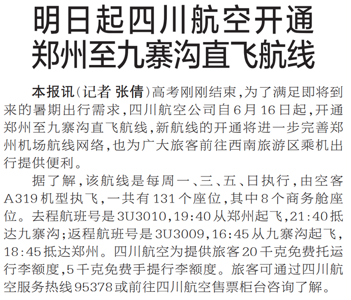 高考刚刚结束,为了满足即将到来的暑期出行需求,四川航空公司自6月16日起,开通郑州至九寨沟直飞航线,新航线的开通将进一步完善郑州机场航线网络,也为广大旅客前往西南旅游区乘机出行提供便利。(今日《郑州日报》2版)