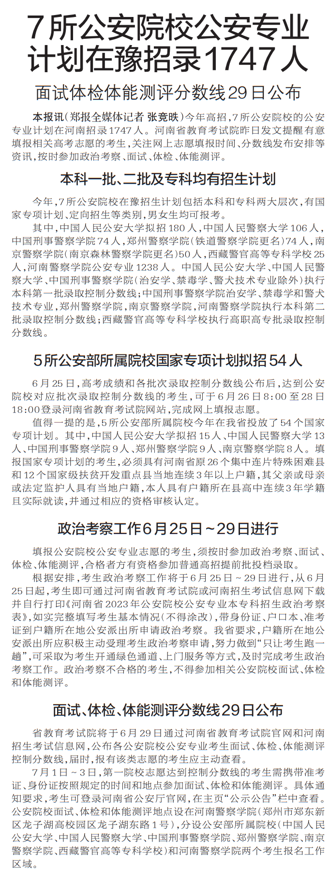 今年高招,7所公安院校的公安专业计划在河南招录1747人。河南省教育考试院昨日发文提醒有意填报相关高考志愿的考生,关注网上志愿填报时间、分数线发布安排等资讯,按时参加政治考察、面试、体检、体能测评。(今日《郑州日报》5版)