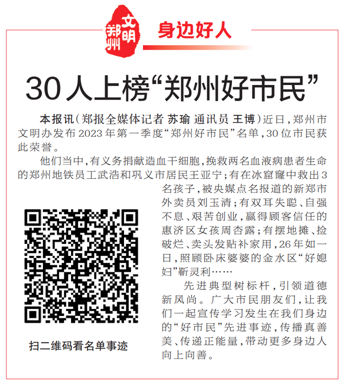 近日,郑州市文明办发布2023年第一季度“郑州好市民”名单,30位市民获此荣誉。(今日《郑州日报》5版)