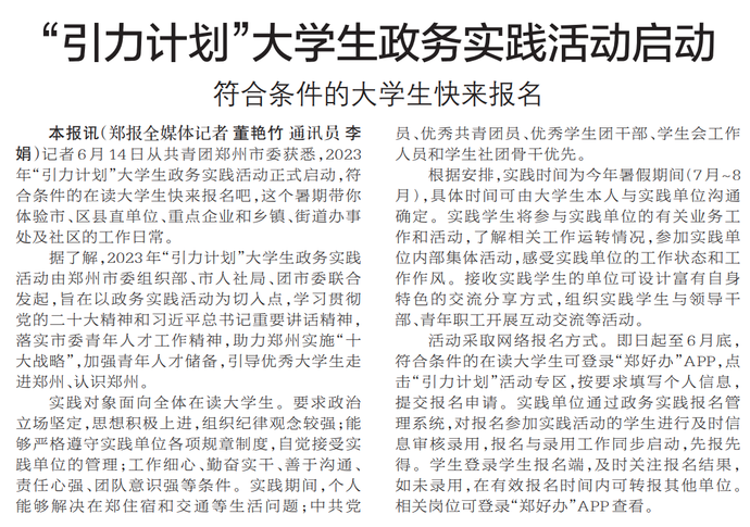 记者6月14日从共青团郑州市委获悉,2023年“引力计划”大学生政务实践活动正式启动,符合条件的在读大学生快来报名吧,这个暑期带你体验市、区县直单位、重点企业和乡镇、街道办事处及社区的工作日常。(今日《郑州日报》5版)