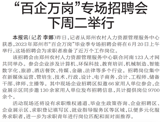 昨日,记者从郑州农村人力资源管理服务中心获悉,2023年郑州市“百企万岗”毕业季专场招聘会将在6月20日上午举行,这场招聘会为求职者准备了近万个工作岗位。(今日《郑州日报》5版)