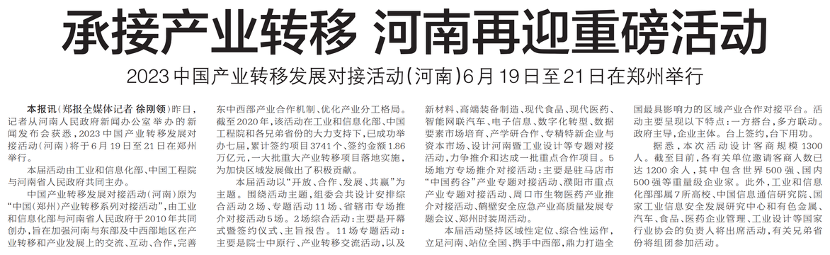 昨日,记者从河南人民政府新闻办公室举办的新闻发布会获悉,2023中国产业转移发展对接活动(河南)将于6月19日至21日在郑州举行。(今日《郑州日报》6版)