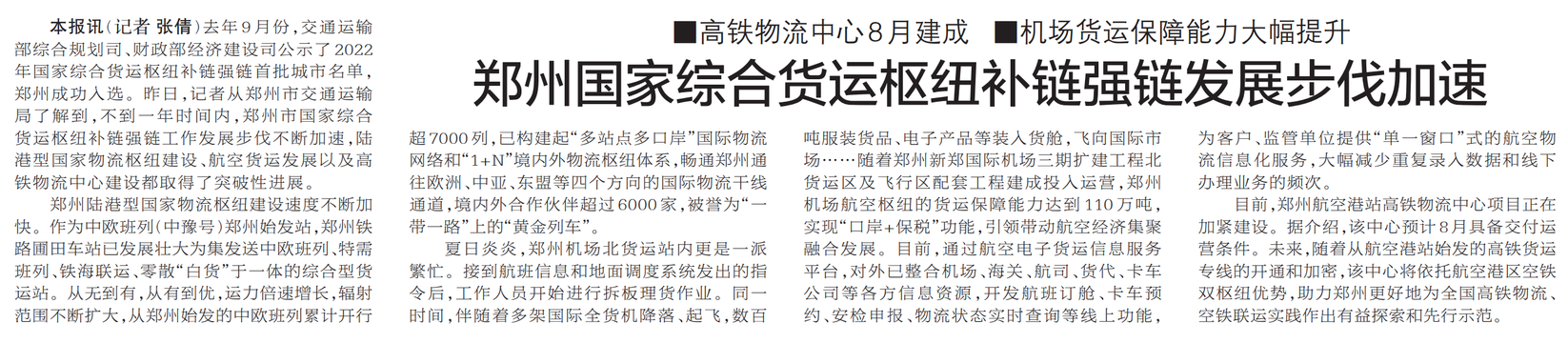 郑州国家综合货运枢纽补链强链发展步伐加速