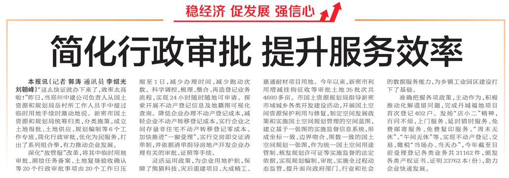 “这么快证就办下来了,效率太高啦!”昨日,当郑州中建公司负责人从国土资源和规划局岳村所工作人员手中接过临时用地手续时激动地说。新密市国土资源和规划局统筹归类,分类施策,成立土地报批、土地供应、规划编制等6个工作专班,简化行政审批,优化为民服务,打出了系列组合拳,有力推动企业发展。(今日《郑州日报》7版)