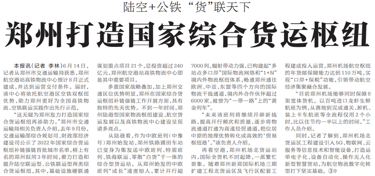 郑州打造国家综合货运枢纽