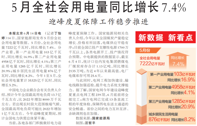 5月全社会用电量同比增长7.4%