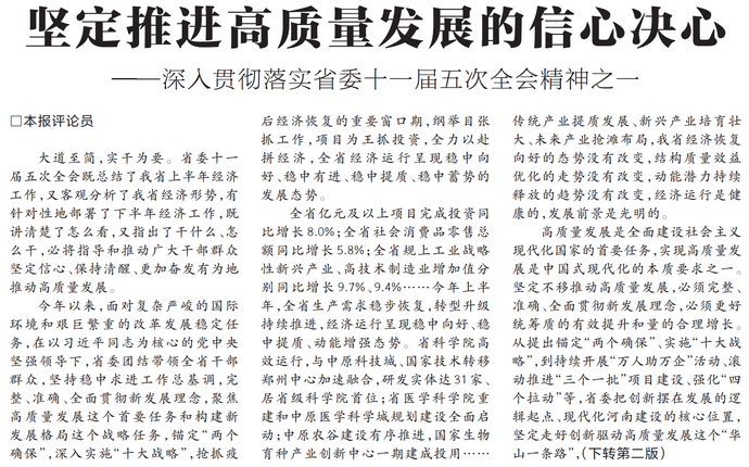 大道至简,实干为要。省委十一届五次全会既总结了我省上半年经济工作,又客观分析了我省经济形势,有针对性地部署了下半年经济工作,既讲清楚了怎么看,又指出了干什么、怎么干,必将指导和推动广大干部群众坚定信心、保持清醒、更加奋发有为地推动高质量发展。(今日《河南日报》1版、2版)