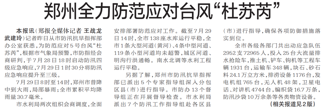 记者昨日从市防汛抗旱指挥部办公室获悉,为防范应对5号台风“杜苏芮”,根据市气象局预警,市防指经会商研判,于7月28日18时启动防汛四级应急响应,7月29日1时30分将防汛应急响应提升至三级。(今日《郑州日报》1版、2版)