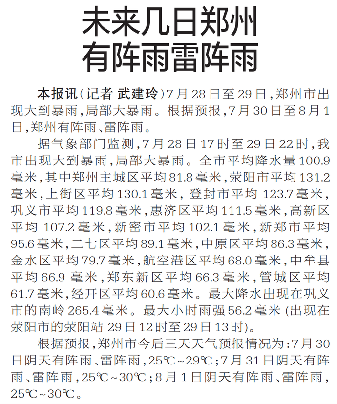 7月28日至29日,郑州市出现大到暴雨,局部大暴雨。根据预报,7月30日至8月1日,郑州有阵雨、雷阵雨。(今日《郑州日报》1版)