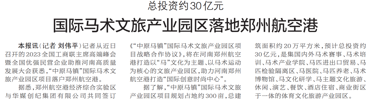 记者从近日召开的2023全国工商联主席高端峰会暨全国优强民营企业助推河南高质量发展大会获悉,“中原马镇”国际马术文旅产业园区项目落户郑州航空港。(今日《郑州日报》2版)