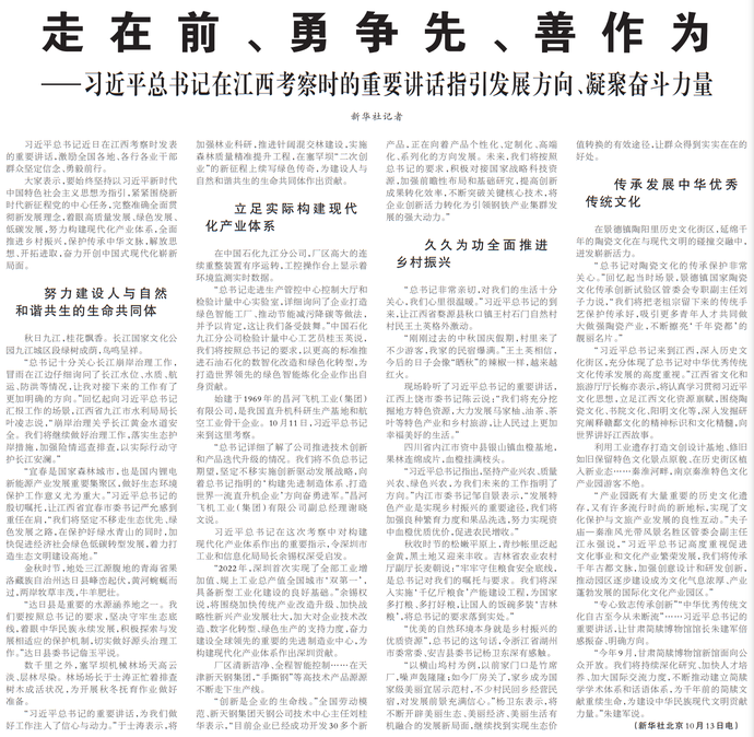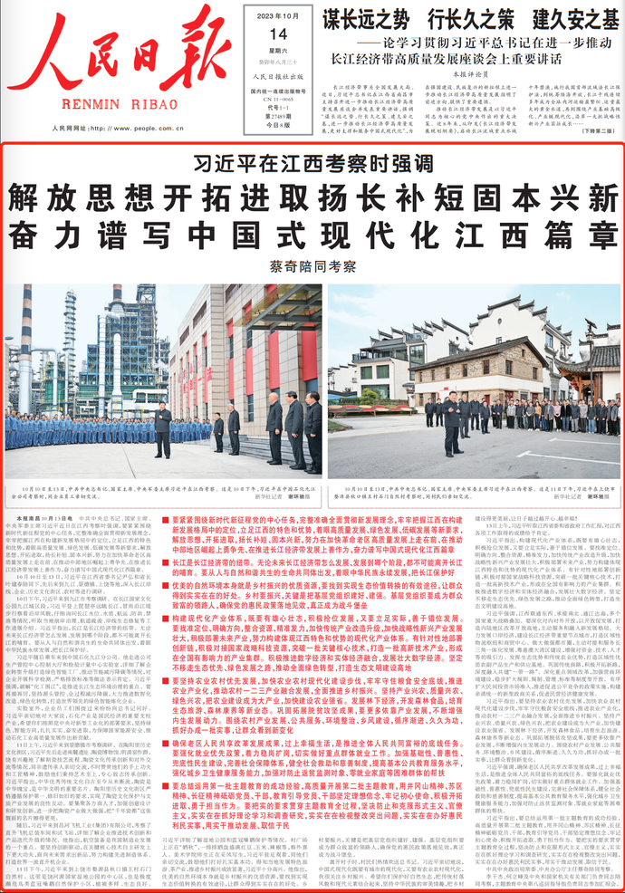 中共中央总书记、国家主席、中央军委主席习近平近日在江西考察时强调,要紧紧围绕新时代新征程党的中心任务,完整准确全面贯彻新发展理念,牢牢把握江西在构建新发展格局中的定位,立足江西的特色和优势,着眼高质量发展、绿色发展、低碳发展等新要求,解放思想、开拓进取,扬长补短、固本兴新,努力在加快革命老区高质量发展上走在前、在推动中部地区崛起上勇争先、在推进长江经济带发展上善作为,奋力谱写中国式现代化江西篇章。(今日《人民日报》1版)