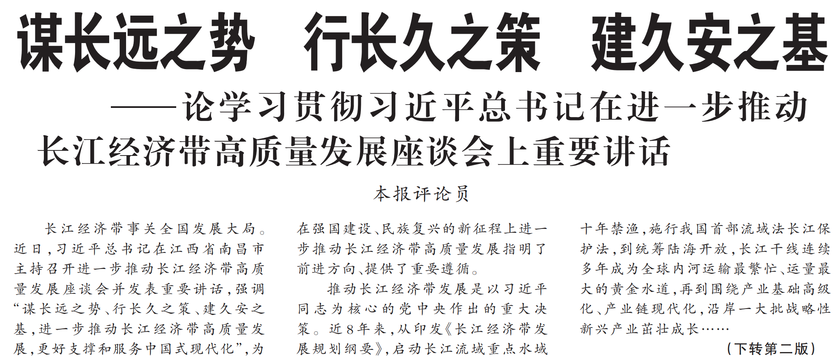 长江经济带事关全国发展大局。近日,习近平总书记在江西省南昌市主持召开进一步推动长江经济带高质量发展座谈会并发表重要讲话,强调“谋长远之势、行长久之策、建久安之基,进一步推动长江经济带高质量发展,更好支撑和服务中国式现代化”,为在强国建设、民族复兴的新征程上进一步推动长江经济带高质量发展指明了前进方向、提供了重要遵循。(今日《人民日报》1版、2版)