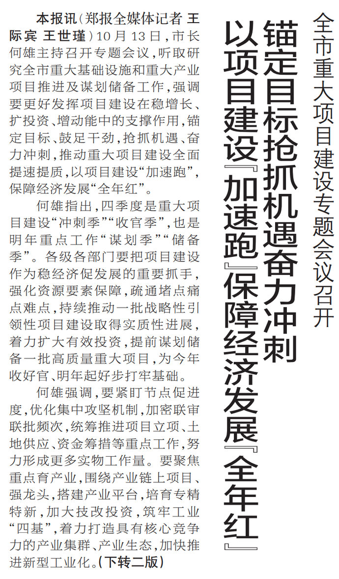 10月13日,市长何雄主持召开专题会议,听取研究全市重大基础设施和重大产业项目推进及谋划储备工作,强调要更好发挥项目建设在稳增长、扩投资、增动能中的支撑作用,锚定目标、鼓足干劲,抢抓机遇、奋力冲刺,推动重大项目建设全面提速提质,以项目建设“加速跑”,保障经济发展“全年红”。(今日《郑州日报》1版、2版)