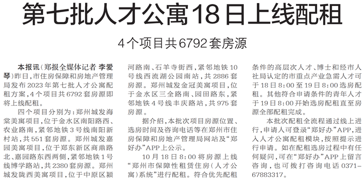 昨日,市住房保障和房地产管理局发布2023年第七批人才公寓配租方案,4个项目共6792套房源即将上线配租。(今日《郑州日报》1版)