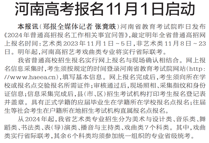 河南省教育考试院昨日发布《2024年普通高招报名工作相关事宜问答》,敲定明年全省普通高招网上报名时间:艺术类2023年11月1日~5日,非艺术类11月8日~23日。明年起,河南高招艺考戏曲类专业将实行省际联考。(今日《郑州日报》2版)