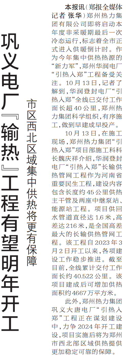 郑州热力集团有限公司即将启动本年度非采暖期最后一次冷态运行,标志着全市正式进入供暖倒计时。作为今年集中供热热源的“新力军”,郑州华润电厂“引热入郑”工程备受关注。10月13日,记者了解到,华润登封电厂“引热入郑”全线已交付工作面长超40公里,郑州热力集团科学组织,有序施工,做到早建成早投产。(今日《郑州日报》2版)
