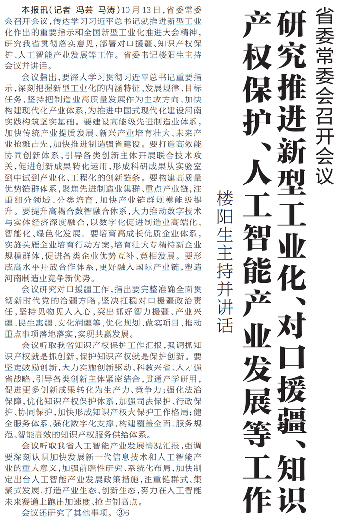 10月13日,省委常委会召开会议,传达学习习近平总书记就推进新型工业化作出的重要指示和全国新型工业化推进大会精神,研究我省贯彻落实意见,部署对口援疆、知识产权保护、人工智能产业发展等工作。省委书记楼阳生主持会议并讲话。(今日《河南日报》1版)
