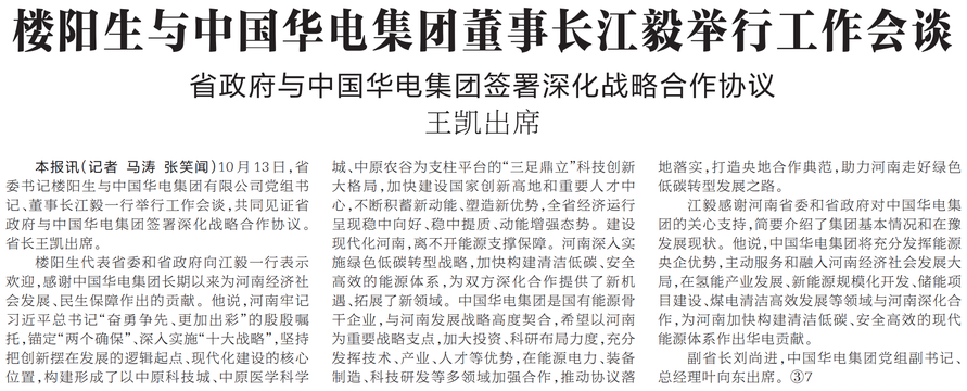 10月13日,省委书记楼阳生与中国华电集团有限公司党组书记、董事长江毅一行举行工作会谈,共同见证省政府与中国华电集团签署深化战略合作协议。省长王凯出席。(今日《河南日报》1版)