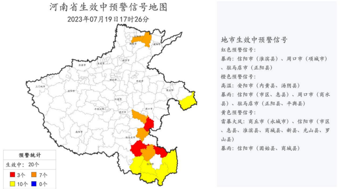 全省各级气象部门严密监视天气变化,递进式开展影响预报和气象风险预警服务。7月18日,河南省气象局发布《天气报告》;截至19日17时26分,全省共发布暴雨、雷暴大风、高温等预警信号34条,目前生效中的预警信号20条。新县(12时54分)、商城(13时13分)、光山(13时59分)、淮滨(15时34分)、项城(17时15分)、正阳(17时20分)发布暴雨红色预警信号。各地各部门需继续密切关注属地气象台站发布的最新天气预报、气象灾害预警信号和气象风险提示。全省各级气象部门将继续加强监测,做好预报预警服务。
