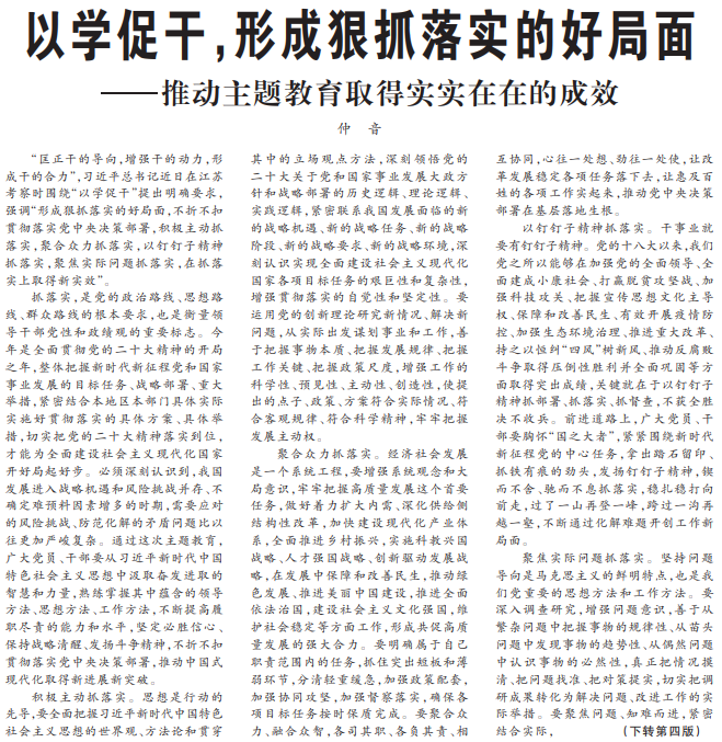 “匡正干的导向,增强干的动力,形成干的合力”,习近平总书记近日在江苏考察时围绕“以学促干”提出明确要求,强调“形成狠抓落实的好局面,不折不扣贯彻落实党中央决策部署,积极主动抓落实,聚合众力抓落实,以钉钉子精神抓落实,聚焦实际问题抓落实,在抓落实上取得新实效”。(今日《人民日报》1版、4版)