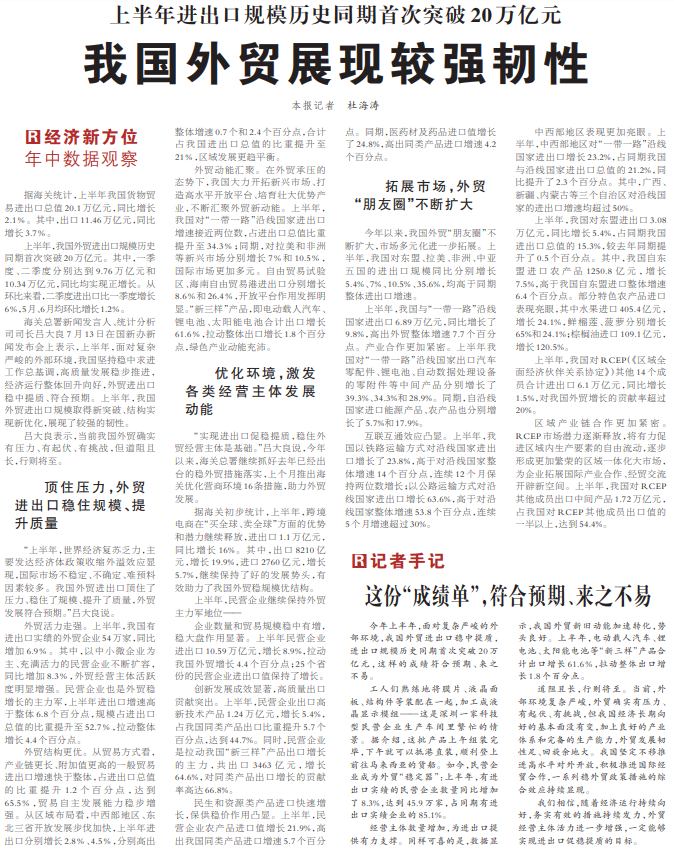 上半年进出口规模历史同期首次突破20万亿元