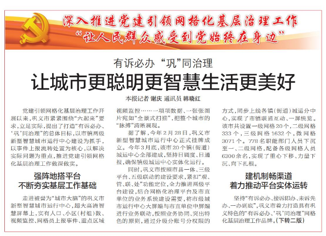 党建引领网格化基层治理工作开展以来,巩义市紧紧围绕“六起来”要求,立足实际,提出了打造“有诉必办、‘巩’同治理”的总体目标,以市镇两级新型智慧城市运行中心建设为抓手,以事件上报流转处置为核心,以解决实际问题为重点,推进党建引领网格化基层治理工作做深做实。(今日《郑州日报》1版、2版)