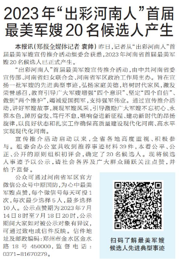 昨日,记者从“出彩河南人”首届最美军嫂宣传推介活动组委会获悉,2023年河南省首届最美军嫂20名候选人已正式产生。(今日《郑州日报》2版)