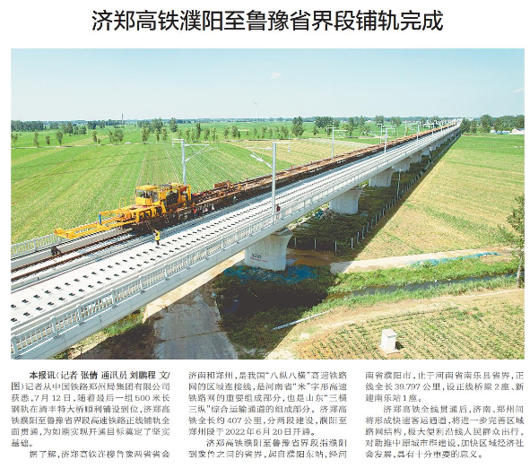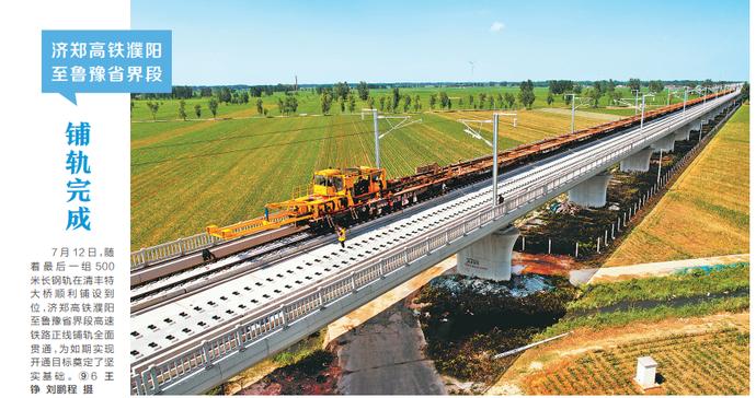 记者从中国铁路郑州局集团有限公司获悉,7月12日,随着最后一组500米长钢轨在清丰特大桥顺利铺设到位,济郑高铁濮阳至鲁豫省界段高速铁路正线铺轨全面贯通,为如期实现开通目标奠定了坚实基础。(今日《郑州日报》6版)
