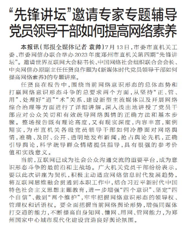 7月13日,市委市直机关工委、市委网信办联合举办2023年度郑州市直机关第四期“先锋讲坛”。邀请世界互联网大会秘书长、中国网络社会组织联合会会长、中央网信办原副主任任贤良作题为《新媒体时代党员领导干部如何提高网络素养》的专题讲座。(今日《郑州日报》2版)