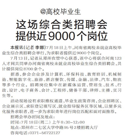 7月18日上午,河南省离校未就业高校毕业生综合类招聘会举行,为求职者提供近9000个岗位。(今日《郑州日报》2版)