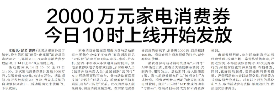 记者从市商务局了解到,作为第四届“醉美·夜郑州”消费季重点活动之一,郑州2000万元家电消费券发放活动,于14日上午10点准时上线。(今日《郑州日报》5版)