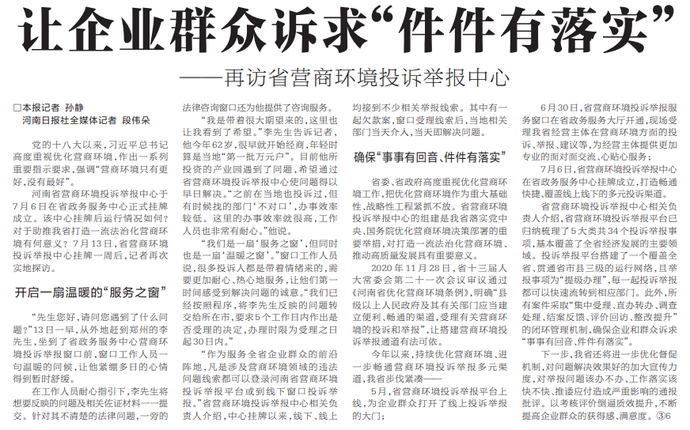 河南省营商环境投诉举报中心于7月6日在省政务服务中心正式挂牌成立。该中心挂牌后运行情况如何?对于助推我省打造一流法治化营商环境有何意义?7月13日,省营商环境投诉举报中心挂牌一周后,记者再次实地探访。(今日《河南日报》2版)