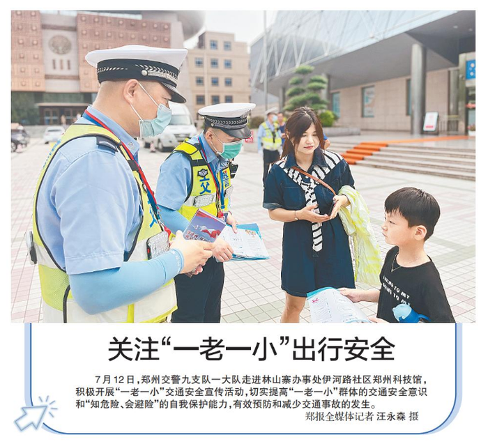 7月12日,郑州交警九支队一大队走进林山寨办事处伊河路社区郑州科技馆,积极开展“一老一小”交通安全宣传活动,切实提高“一老一小”群体的交通安全意识和“知危险、会避险”的自我保护能力,有效预防和减少交通事故的发生。(今日《郑州日报》5版)