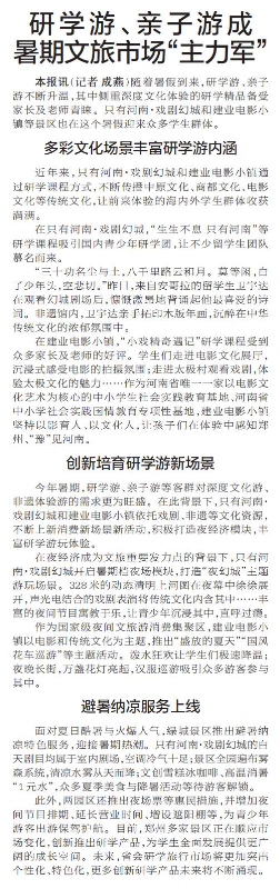 随着暑假到来,研学游、亲子游不断升温,其中侧重深度文化体验的研学精品备受家长及老师青睐。只有河南·戏剧幻城和建业电影小镇等景区也在这个暑假迎来众多学生群体。(今日《郑州日报》6版)