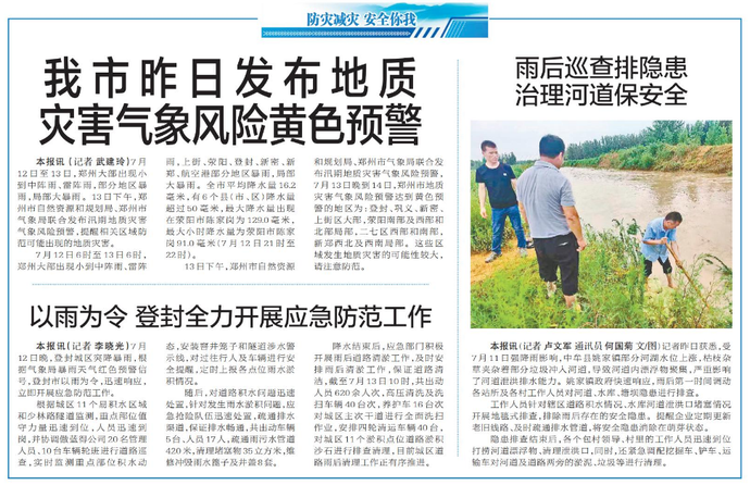 7月12日晚,登封城区突降暴雨,根据气象局暴雨天气红色预警信号,登封市以雨为令,迅速响应,立即开展应急防范工作。(今日《郑州日报》7版)
