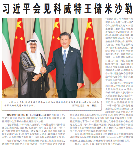 9月22日下午,国家主席习近平在杭州西湖国宾馆会见来华出席第19届亚洲运动会开幕式的科威特王储米沙勒。(今日《人民日报》1版)