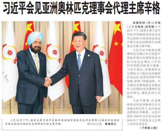 9月22日下午,国家主席习近平在杭州西湖国宾馆会见来华出席第19届亚洲运动会开幕式的亚洲奥林匹克理事会代理主席辛格。(今日《人民日报》1版、3版)