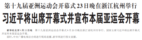 第十九届亚洲运动会开幕式9月23日晚在浙江省杭州市举行。国家主席习近平将出席开幕式并宣布本届亚运会开幕。(今日《人民日报》1版)