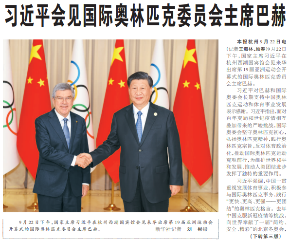 9月22日下午,国家主席习近平在杭州西湖国宾馆会见来华出席第19届亚洲运动会开幕式的国际奥林匹克委员会主席巴赫。(今日《人民日报》1版、3版)