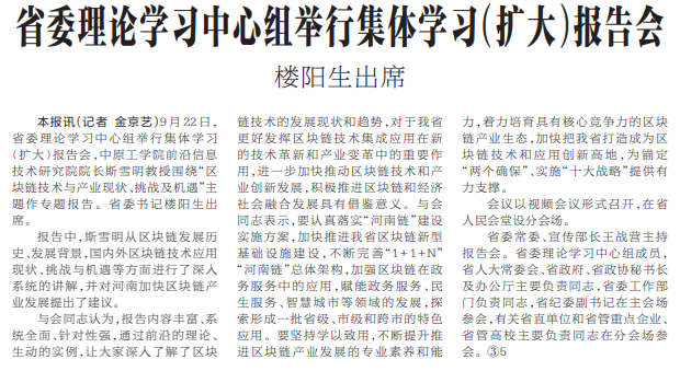 9月22日,省委理论学习中心组举行集体学习(扩大)报告会,中原工学院前沿信息技术研究院院长斯雪明教授围绕“区块链技术与产业现状、挑战及机遇”主题作专题报告。省委书记楼阳生出席。