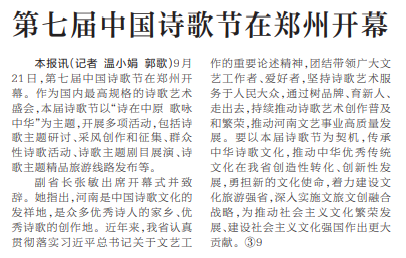9月21日,第七届中国诗歌节在郑州开幕。作为国内最高规格的诗歌艺术盛会,本届诗歌节以“诗在中原歌咏中华”为主题,开展多项活动,包括诗歌主题研讨、采风创作和征集、群众性诗歌活动、诗歌主题剧目展演、诗歌主题精品旅游线路发布等。(今日《河南日报》2版)