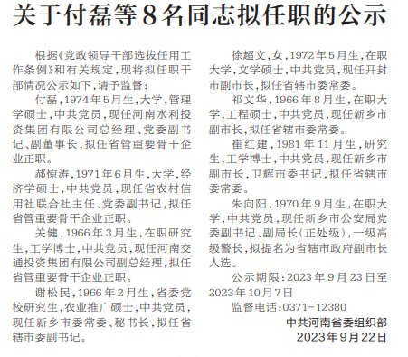 根据《党政领导干部选拔任用工作条例》和有关规定,现将拟任职干部情况公示如下,请予监督。(今日《河南日报》2版)