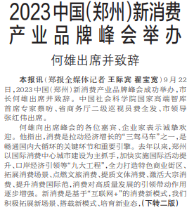 9月22日,2023中国(郑州)新消费产业品牌峰会成功举办,市长何雄出席并致辞。中国社会科学院国家高端智库首席专家蔡昉、省商务厅二级巡视员费全发、市领导张红伟出席。(今日《郑州日报》1版、2版)