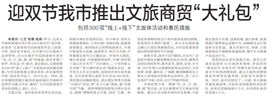 昨日,记者从市政府新闻办举行的2023郑州市“迎中秋、庆国庆”文旅商贸活动新闻发布会上获悉,中秋、国庆双节临近,为丰富节日文旅体产品多样性,全方位提升市民和游客在郑州“吃、住、行、游、购、娱”的体验,我市多部门协作、各区县(市)联合、政企联动,近期将推出500项“线上+线下”文旅体活动和惠民措施,为市民游客度过喜庆祥和、欢乐愉悦的中秋、国庆双节送上一份大礼包。同时,我市将继续把提升服务质量和强化市场秩序监管作为重点内容,确保广大市民和游客在郑州玩得放心、舒心、开心。(今日《郑州日报》2版)