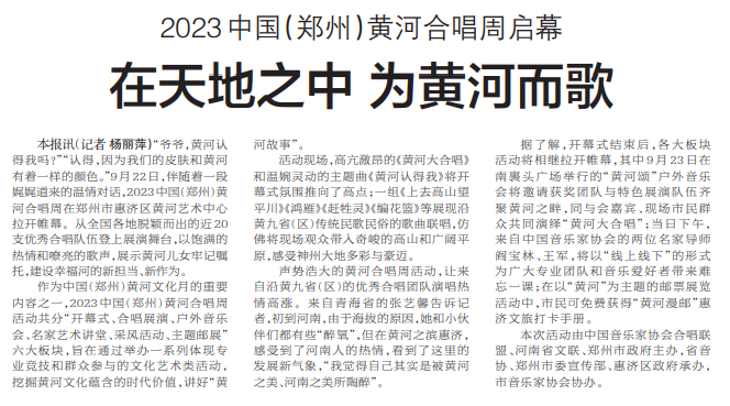 “爷爷,黄河认得我吗?”“认得,因为我们的皮肤和黄河有着一样的颜色。”9月22日,伴随着一段娓娓道来的温情对话,2023中国(郑州)黄河合唱周在郑州市惠济区黄河艺术中心拉开帷幕。从全国各地脱颖而出的近20支优秀合唱队伍登上展演舞台,以饱满的热情和嘹亮的歌声,展示黄河儿女牢记嘱托,建设幸福河的新担当、新作为。(今日《郑州日报》2版)