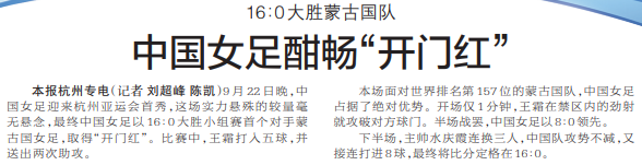 9月22日晚,中国女足迎来杭州亚运会首秀,这场实力悬殊的较量毫无悬念,最终中国女足以16∶0大胜小组赛首个对手蒙古国女足,取得“开门红”。比赛中,王霜打入五球,并送出两次助攻。(今日《郑州日报》3版)